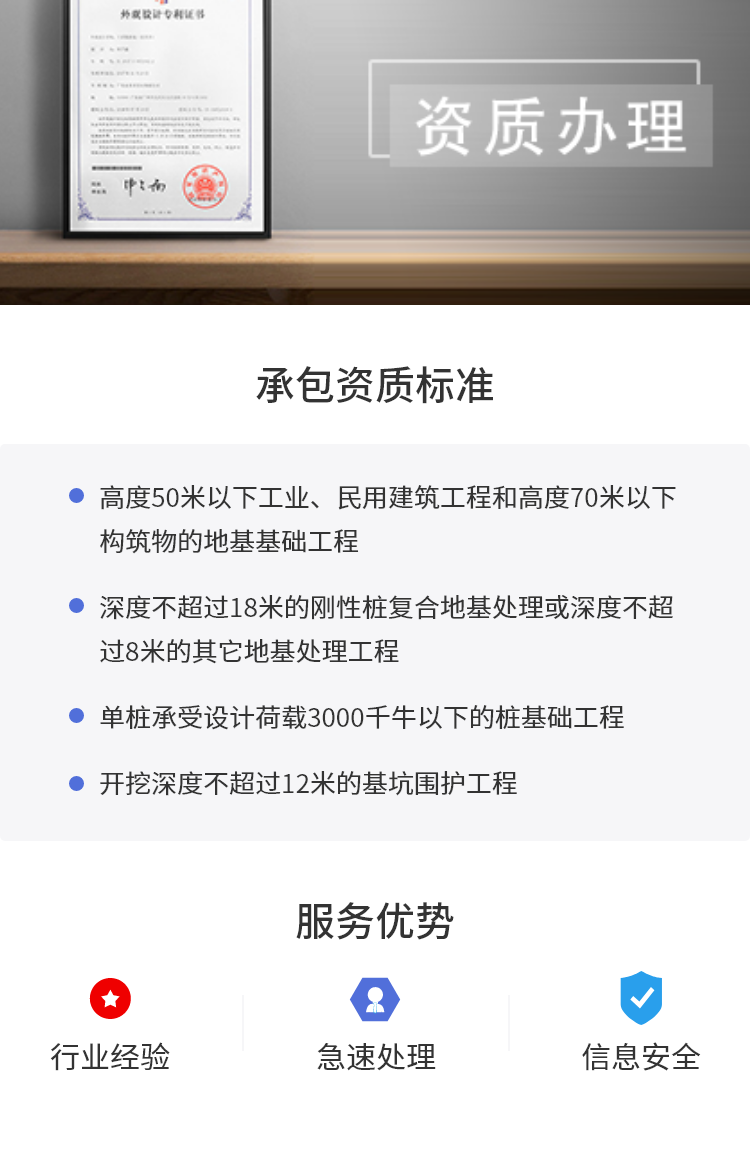 以上關(guān)于”地基基礎工程專業(yè)承包資質(zhì)標準(三級)“資料僅供參考,若想詳細更多信息,歡迎來電咨詢:400-600-2247(免市話費),每天前10名咨詢的客戶可享受公司注冊免費核名服務!