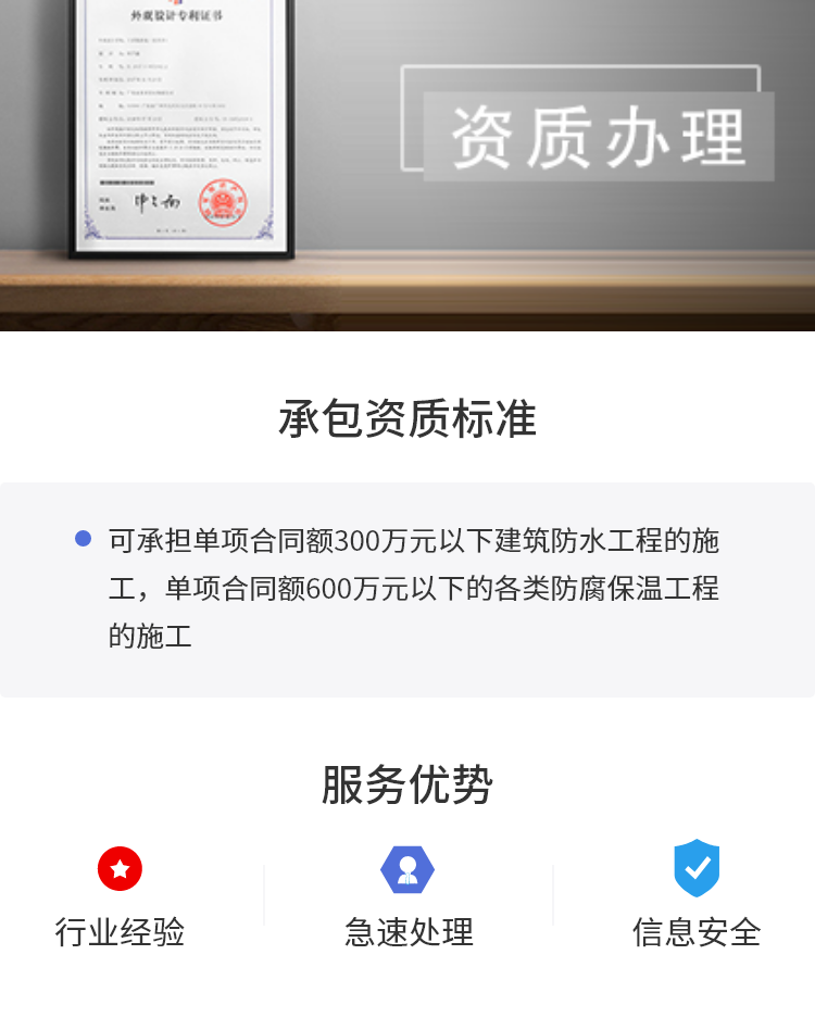 以上關(guān)于”防水防腐保溫工程專業(yè)承包資質(zhì)標(biāo)準(zhǔn)(二級)“資料僅供參考,若想詳細(xì)更多信息,歡迎來電咨詢:400-600-2247(免市話費),每天前10名咨詢的客戶可享受公司注冊免費核名服務(wù)!